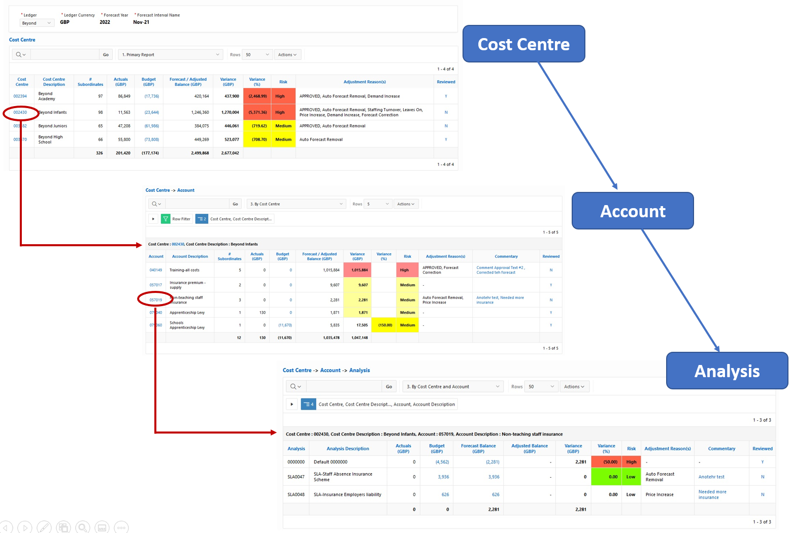 There is also the ability to view through Cost Centre or Subjective/Account hierarchies too. We understand that users need to be able to see values at the top level of a hirearchy and then have the easy ability to drill down through the hirearchy levels to get the level of detail they need. No matter how many levels you have, we have designed the solution to make drilling fast, accurate and easy for anyone to do